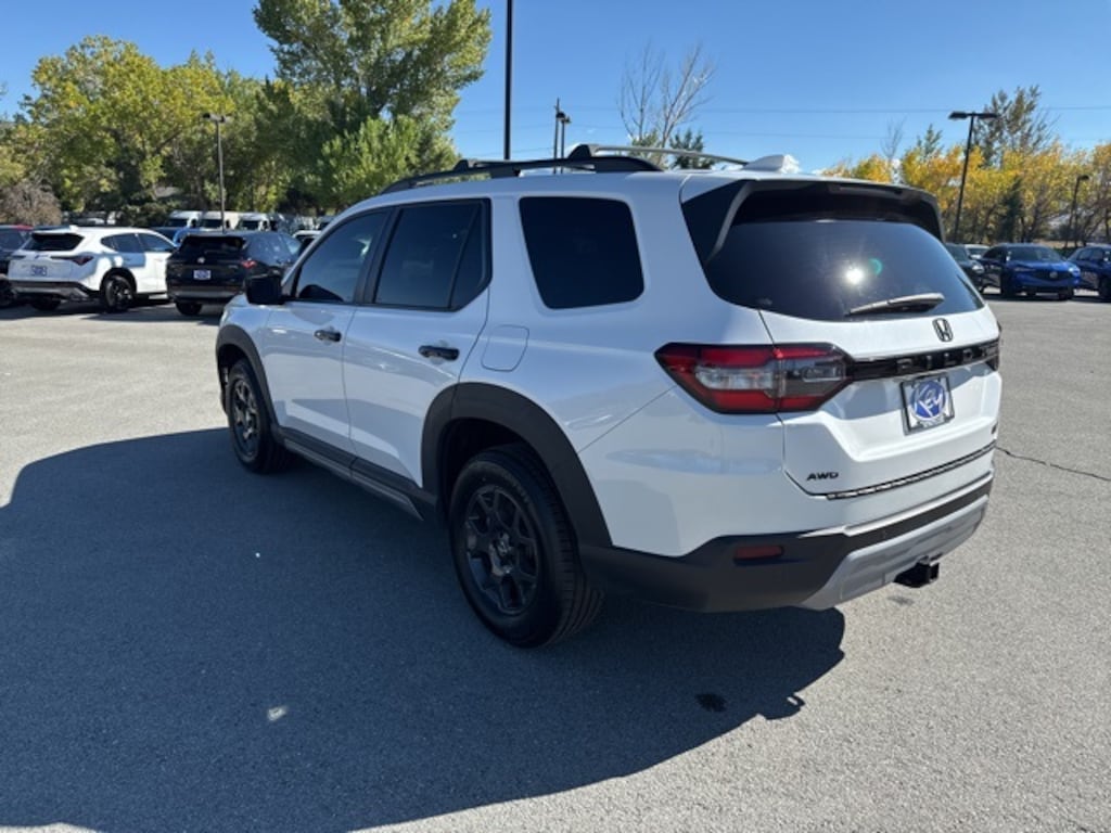 This Pilot TrailSport is nicely equipped with AWD, 3rd row seats: split-bench, 4-Wheel Disc Brakes, 9 Speakers, ABS brakes, Adaptive Cruise Control: Adaptive Cruise Control (ACC) with Low-Speed Follow, Air Conditioning, Alloy wheels, AM/FM radio: SiriusXM, Apple CarPlay/Android Auto, Auto High-beam Headlights, Auto-dimming Rear-View mirror, Automatic temperature control, Axle Ratio: 4.167, Blind Spot Information (BSI) System warning, Brake assist, Bumpers: body-color, Delay-off headlights, Driver door bin, Driver vanity mirror, Dual front impact airbags, Dual front side impact airbags, Durable Synthetic Leather Seat Trim, Electronic Stability Control, Emergency communication system: HondaLink Assist, Four wheel independent suspension, Front anti-roll bar, Front Bucket Seats, Front Center Armrest, Front dual zone A/C, Front fog lights, Front reading lights, Fully automatic headlights, Garage door transmitter: HomeLink, Heated door mirrors, Heated Front Bucket Seats, Heated front seats, Illuminated entry, Knee airbag, Lane departure: Lane Keeping Assist System (LKAS) active, Low tire pressure warning, Memory seat, Occupant sensing airbag, Outside temperature display, Overhead airbag, Overhead console, Panic alarm, Passenger door bin, Passenger vanity mirror, Power door mirrors, Power driver seat, Power Liftgate, Power moonroof, Power passenger seat, Power steering, Power windows, Radio data system, Radio: 245-Watt Audio System, Rear air conditioning, Rear anti-roll bar, Rear reading lights, Rear window defroster, Rear window wiper, Reclining 3rd row seat, Remote keyless entry, Security system, Speed control, Speed-sensing steering, Speed-Sensitive Wipers, Split folding rear seat, Spoiler, Steering wheel mounted audio controls, Tachometer, Telescoping steering wheel, Tilt steering wheel, Traction control, Trip computer, Turn signal indicator mirrors, Variably intermittent wipers, and Wheels: 18" Fully Painted Shark Gray w/Blk Lug Nuts.